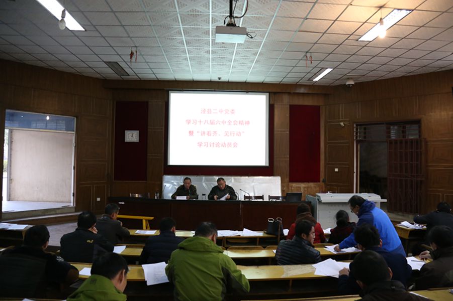 首先,党委副书记吴征兵带领全体党员认真学习了党的十八届六中全会精神、《泾县二中开展观念更新学习讨论活动实施方案》和《在全校党员干部中开展“讲看齐、见行动”学习讨论实施方案》,并对近期学校党建工作做出部署和要求。